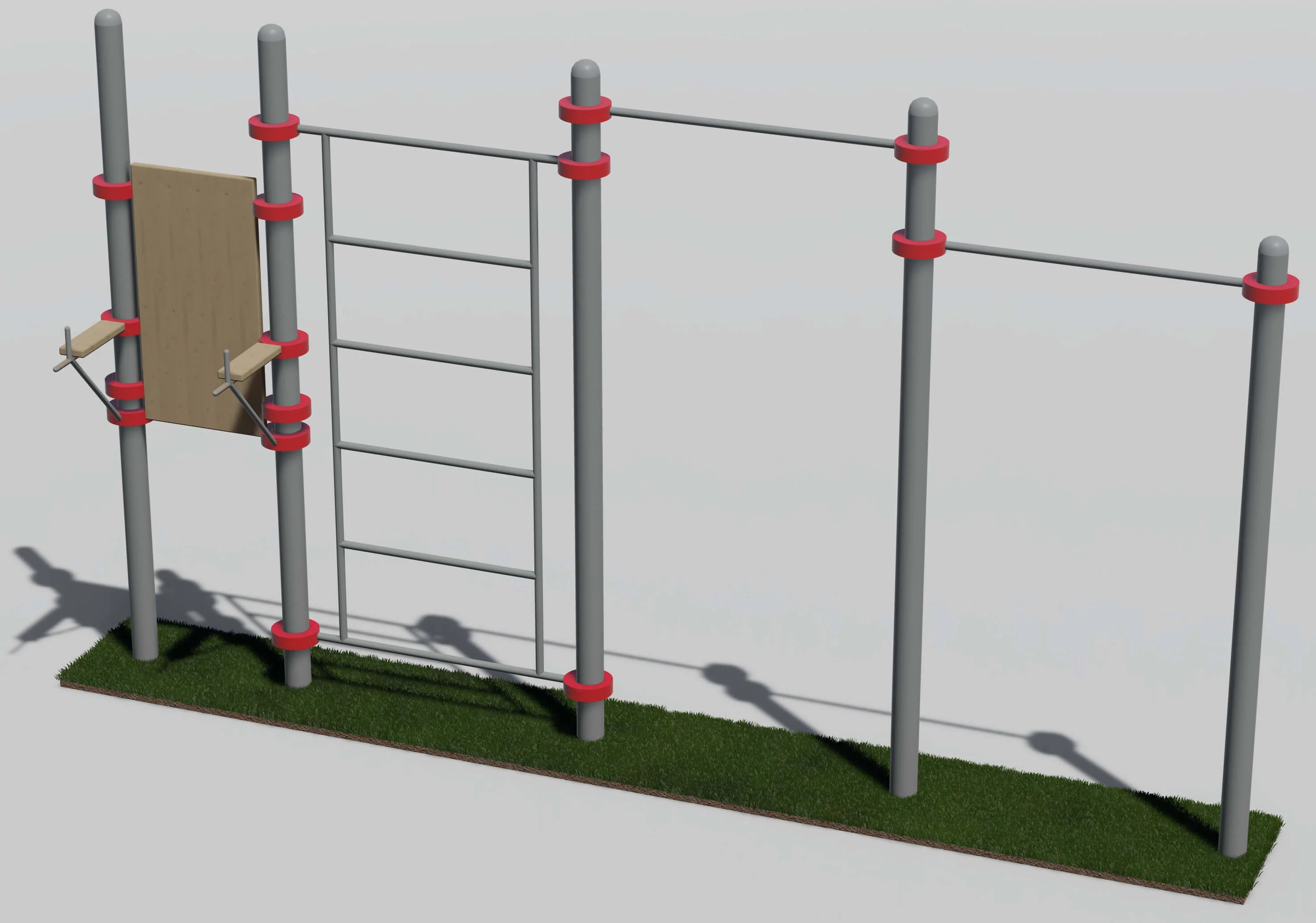 К опорным столбам высотой 2600 мм, 2300мм крепится с помощью хомутов на высоте от уровня основания: 2550 мм, 2200 мм – перекладина турника шириной 1200 мм, шведская стенка фиксируется на высоте 2450 мм. Ширина шведской стенки 1200 мм. Шаг составляет – 34 см. Доска и подлокотники для элемента комплекса «Вертикальный пресс» фиксируются так же при помощи хомутов на удобную высота для выполнения упражнений на пресс. Доска выполнена из материала – лиственница.