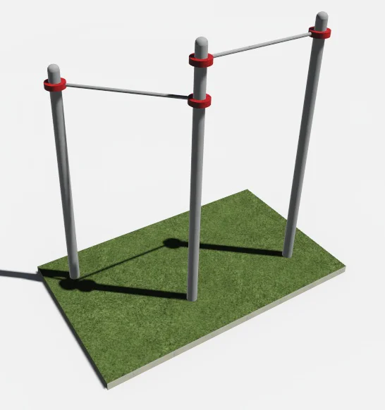 Комплекс состоит из трех опорных столбов высотой 2600 мм, 2600 мм, 2300 мм., диаметр которых предоставляется на выбор, двух горизонтальных перекладин длиной 1200 мм, расположенная на высоте 2400 мм, 2100 мм от поверхности основания. Перекладины крепится к опорным столбам при помощи хомутов. Длина комплекса не более 2700 мм.